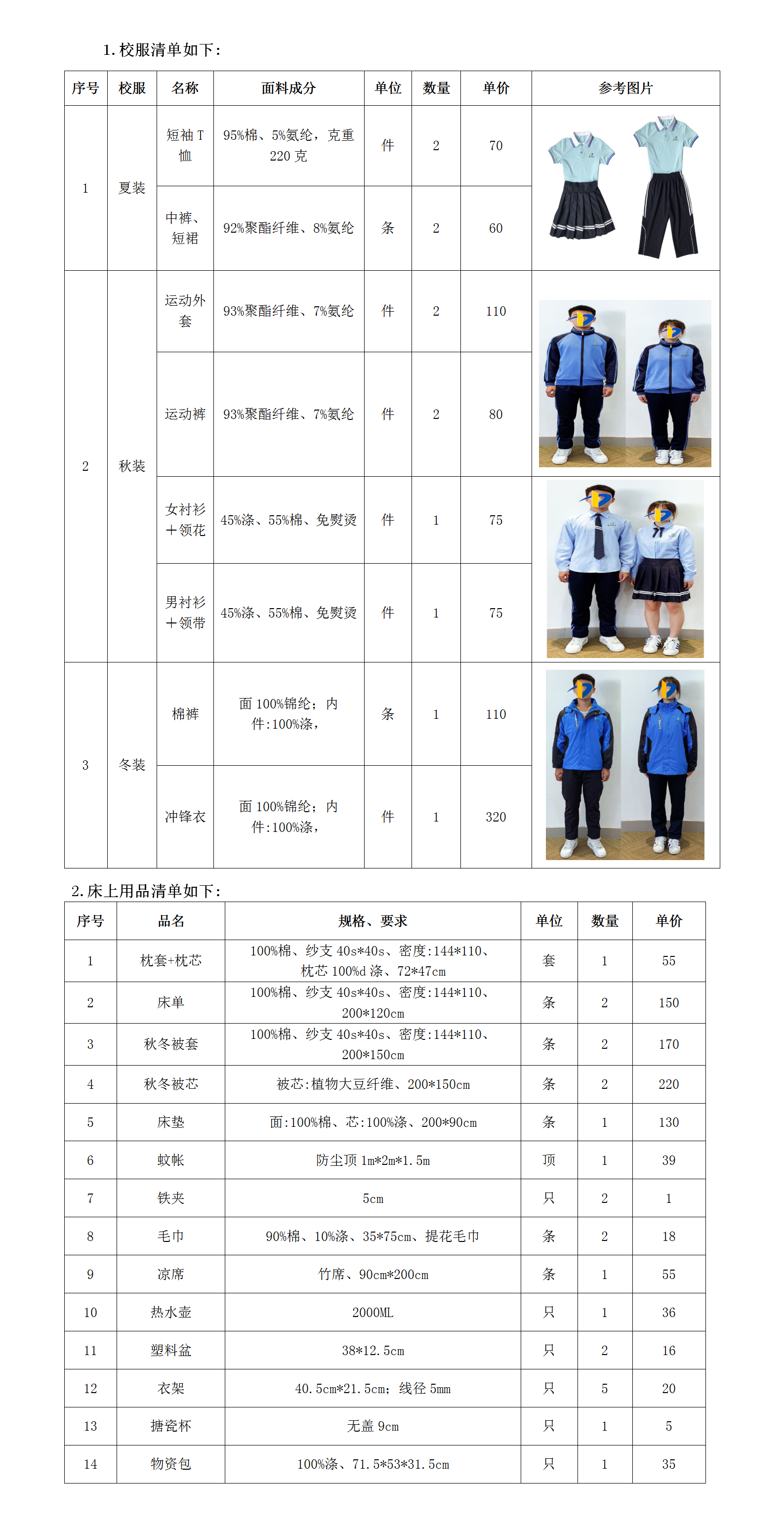 名稱:見(jiàn)附件。 品牌:蘇星。 規(guī)格參數(shù):見(jiàn)附件。 數(shù)量:見(jiàn)附件,按實(shí)結(jié)算。 價(jià)格:校服1220元/套、床上用品950元/套。 服務(wù)年限:貳年,合同一年一簽。一年合同期滿后經(jīng)采購(gòu)單位考核合格后可續(xù)簽下一年合同??己瞬缓细竦?,終止合同不再續(xù)簽(合同期內(nèi)價(jià)格保持一致)。 質(zhì)量標(biāo)準(zhǔn):所有檢測(cè)指標(biāo)必須符合國(guó)家相關(guān)標(biāo)準(zhǔn)及本次采購(gòu)項(xiàng)目的技術(shù)要求,檢驗(yàn)依據(jù)GB 31701-2015《嬰幼兒及兒童紡織產(chǎn)品安全技術(shù)規(guī)范》,GB/T 31888-2015《中小學(xué)生校服》,GB18401-2010《國(guó)家紡織產(chǎn)品基本安全技術(shù)規(guī)范》。 售后服務(wù):1、免費(fèi)質(zhì)保期1年,自物品驗(yàn)收合格之日起(采購(gòu)人代表在驗(yàn)收?qǐng)?bào)告上簽字之日起計(jì)算)至少12個(gè)月內(nèi)正常使用,對(duì)非人為因素?fù)p壞的服裝,承諾無(wú)條件負(fù)責(zé)更換。 2、在投入使用后一年內(nèi),進(jìn)行售后跟蹤,出現(xiàn)質(zhì)量問(wèn)題,將在24小時(shí)內(nèi)解決或提供解決方案。 |