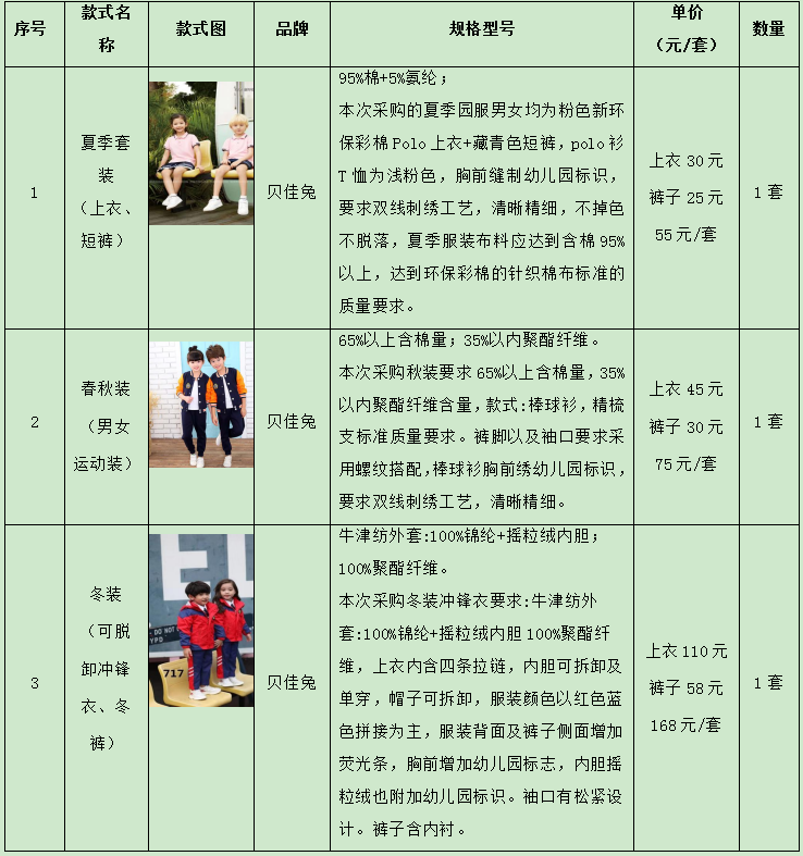 名稱:見附件。 品牌:見附件。 規(guī)格型號(hào)、款式:見附件。 數(shù)量:夏季套裝(上衣、短褲)1套、春秋裝(男女運(yùn)動(dòng)裝)1套、冬裝 (可脫卸沖鋒衣、冬褲)1件。 價(jià)格:詳見附件。 服務(wù)年限:貳年,合同一年一簽。一年合同期滿后經(jīng)采購單位考核合格后可續(xù)簽下一年合同。考核不合格的,終止合同不再續(xù)簽(合同期內(nèi)價(jià)格保持一致)。 質(zhì)量標(biāo)準(zhǔn):所有檢測(cè)指標(biāo)必須符合國家相關(guān)標(biāo)準(zhǔn)及本次采購項(xiàng)目的技術(shù)要求,檢驗(yàn)依據(jù)GB 31701-2015《嬰幼兒及兒童紡織產(chǎn)品安全技術(shù)規(guī)范》或GB 18401-2010《國家紡織產(chǎn)品基本安全技術(shù)規(guī)范》、GB/T 31888-2015《中小學(xué)生校服》 檢測(cè)內(nèi)容包括:甲醛含量、PH值、纖維成分含量、耐水色牢度、耐酸汗?jié)n色牢度、耐堿汗?jié)n色牢度、耐摩擦色牢度、耐水色牢度、可分解致癌芳香胺燃料。 售后服務(wù): 質(zhì)保期:免費(fèi)質(zhì)保期2年,自物品驗(yàn)收合格之日起(采購人代表在驗(yàn)收?qǐng)?bào)告上簽字之日起計(jì)算)24個(gè)月內(nèi)正常使用,對(duì)非人為因素?fù)p壞的園服,承諾無條件負(fù)責(zé)更換。 嚴(yán)格按照國家“三包”政策供貨,在投入使用后2年內(nèi),進(jìn)行售后跟蹤,提供7*24小時(shí)售后服務(wù),出現(xiàn)質(zhì)量問題,將在24小時(shí)內(nèi)解決或提供解決方案。 |