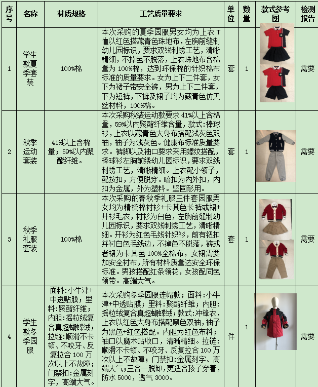 5.項目概況:本項目為常州市新北區(qū)新港幼兒園園服采購項目,包括園服制作、運抵、卸貨至采購人現(xiàn)場指定位置,通過采購人及其他相關(guān)部門的驗收,直至發(fā)放和余貨取回等全過程工作。其中每套園服包含:夏季套裝1套,秋季運動套裝1套、秋季禮服套裝1套、冬季園服1件。成交單位需等到采購人新生報到,征得2/3以上家長同意后,雙方才履行合同,采購人負責將采購款式、數(shù)量交予成交單位,成交單位按照采購人提供的款式、顏色要求制造校服,校服面料必須與采購需求中一致。貧困學生校服征訂工作按教育主管部門相關(guān)文件執(zhí)行。成交單位還需要承擔其他班級園服的增訂工作,具體數(shù)量價格按照現(xiàn)有標準實行。