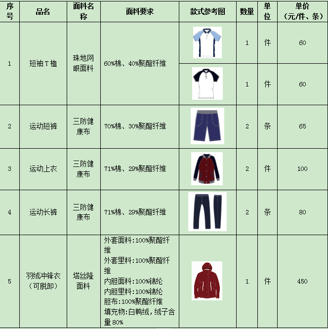 名稱:見附件。 品牌:喬治白。 規(guī)格參數(shù):見附件。 數(shù)量:見附件,按實結(jié)算。 價格:1060元/套。 服務(wù)年限:兩年,合同一年一簽,經(jīng)采購人考核滿意后,方可續(xù)簽下一年合同。 質(zhì)量標準:所有檢測指標必須符合國家相關(guān)標準及本次采購項目的技術(shù)要求,檢驗依據(jù)GB 31701-2015《嬰幼兒及兒童紡織產(chǎn)品安全技術(shù)規(guī)范》,GB/T 31888-2015《中小學(xué)生校服》,GB18401-2010《國家紡織產(chǎn)品基本安全技術(shù)規(guī)范》。生產(chǎn)過程中,如果有相關(guān)新標準出臺,則釆用新標準。沒有提及的標準參照國家和地方相關(guān)最新標準。 售后服務(wù):1、免費質(zhì)保期1年,自物品驗收合格之日起(采購人代表在驗收報告上簽字之日起計算)至少12個月內(nèi)正常使用,對非人為因素損壞的服裝,承諾無條件負責(zé)更換。 2、嚴格按照國家“三包”政策供貨,在投入使用后至少一年內(nèi),進行售后跟蹤,提供7*24小時售后服務(wù),出現(xiàn)質(zhì)量問題,將在24小時內(nèi)解決或提供解決方案。 |